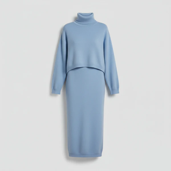 Design & Fabric: An oversized turtleneck sweater with dropped shoulders offers relaxed coziness, paired with a form-flattering midi skirt in the same luxe knit. This two-piece balances warmth and refinement, ideal for cooler days.